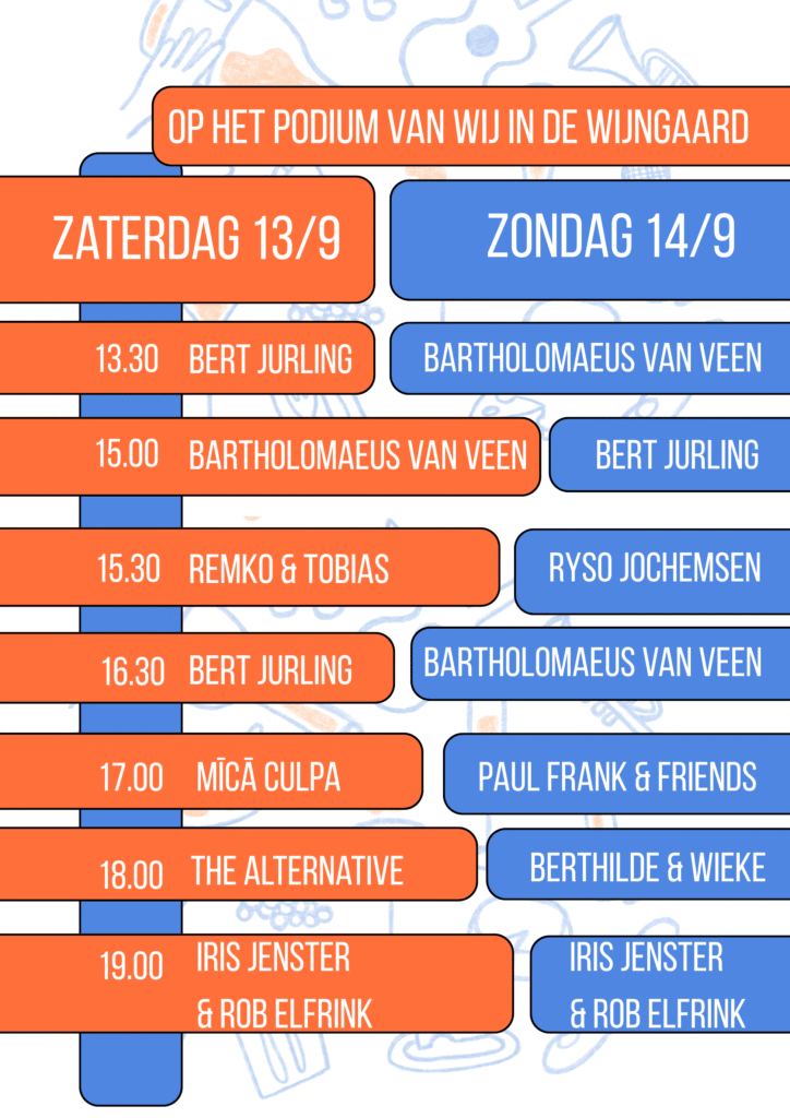 Wijn en muziek gaan prima samen. Wij serveren een veelzijdig programma op het podium van Wij in de wijngaard. Laat je verrassen door singer-songwriters, bands, dichters en een zangduo. Verspreid over de dag geniet je van optredens in allerlei verschillende smaken.